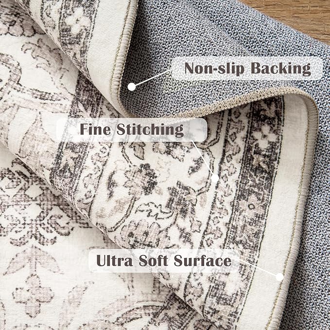 jinchan Round Rug 8ft Washable Circle Soft Rug - Low Pile Vintage 8'Round Indoor Beige Floral Print Stain Resistant Boho Carpet Ultra-Thin Non-Slip for Living Room Bedroom Dining Room Kitchen