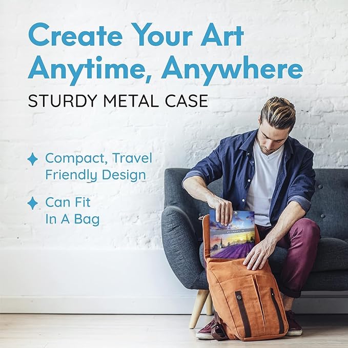 • Portable Creativity On The Go: Bring your artistic vision anywhere with our travel watercolor set. Housed in a sturdy metal case with a handy color swatch, this beginner watercolor set is perfect for students and artists on the move