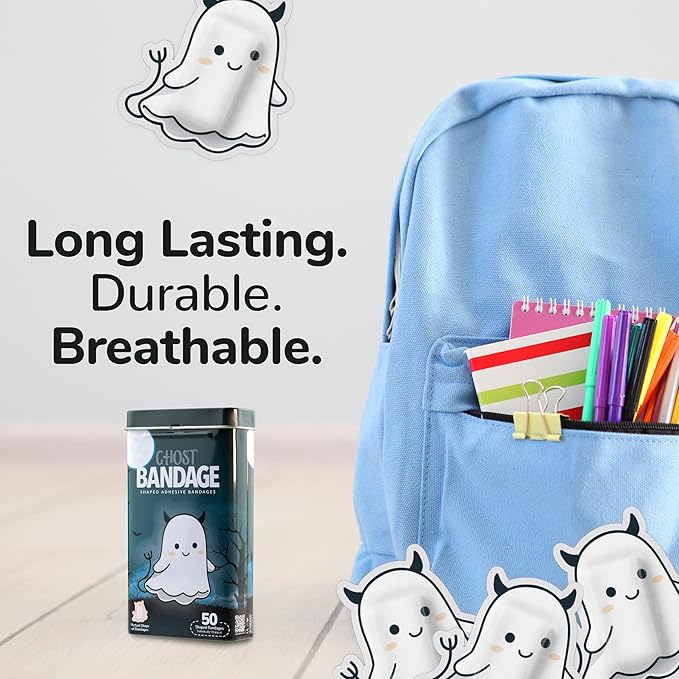 • GHOST HALLOWEEN BANDAGES: This 50 piece tin of frightfully fun Halloween Ghost bandages is great for putting a smile on kids' faces while protecting wounds such as cuts, scrapes, and burns; sticky bandages are perfect for kids and adults alike, and also for school nurses and pediatric doctors