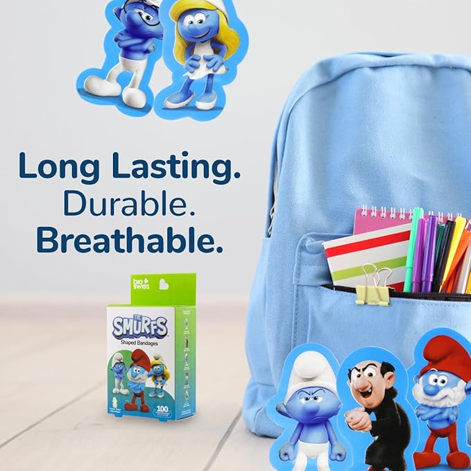 • SMURF BANDAGES: This 100 piece cardboard box of childhood classic cartoon Smurf shaped bandages is great for putting a smile on kids' faces while protecting wounds such as cuts, scrapes, and burns, and come in a variety of your favorite characters; Papa Smurf, Smurfette, Brainy Smurf, Gargamel, and Grouchy Smurf. These sticky bandages are perfect for kids and adults alike, and also for school nurses and pediatric doctors