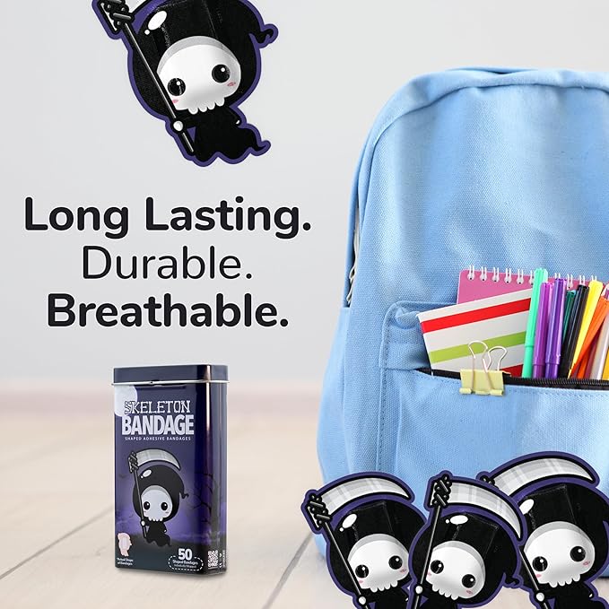 • SKELETON HALLOWEEN BANDAGES: This 50 piece tin of frightfully fun Halloween Skeleton bandages is great for putting a smile on kids' faces while protecting wounds such as cuts, scrapes, and burns; sticky bandages are perfect for kids and adults alike, and also for school nurses and pediatric doctors