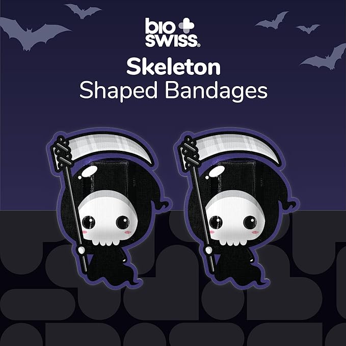 BioSwiss Bandages, Halloween Skeleton Shaped Self Adhesive Bandage, Latex Free Sterile Wound Care, Fun First Aid Kit Supplies for Kids, 50 Count