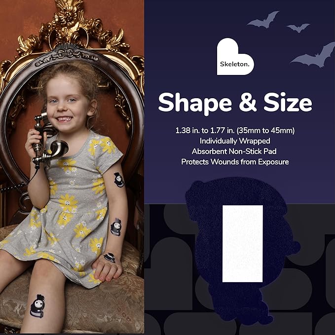 • SAFE PACKAGING: These sterile skeleton cartoon character bandages come in spooky packaging, and are individually wrapped for safe handling; small bandages help protect kids' sensitive wounds from coming into contact with dirt for first aid wound care