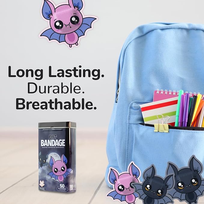 • BAT HALLOWEEN BANDAGES: This 50 piece tin of frightfully fun Halloween Bat bandages is great for putting a smile on kids' faces while protecting wounds such as cuts, scrapes, and burns, and come in 2 styles; sticky bandages are perfect for kids and adults alike, and also for school nurses and pediatric doctors