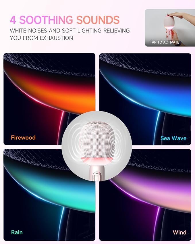 • 【4 Soothing Sound Modes】4 different modes bring immersive relaxation, with the sound of crackling fire, rain, ocean waves, and gentle breeze. The ambient light understands your desired mood, just tap to activate it. With healing Monet tones and 16 RGB dynamic lights, you can switch between 5 lighting effects as you please, soothing your tiredness from a day's work. It is not just a necessity, but also a product that possesses emotional value along with its functional value.