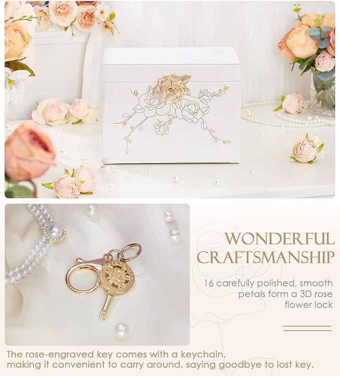 • Leather-Like Design with Lock: The jewelry box's faux leather-inspired design with golden rose accents and a lock ensures both style and security for your treasures.