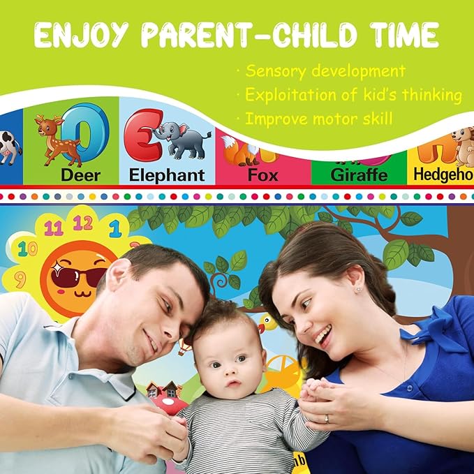 • EDUCATIONAL FUN - Our classroom mat features an engaging alphabet design, with each letter represented by a corresponding animal object. It also includes numbers around the cute sun, various shapes in vibrant colors loaded by a truck, and a rotating disk with months. This baby play mat promotes early education in an exciting way.