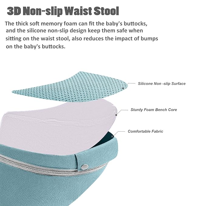 • Ergonomic Hip Seat: The waist stool maintains the baby's M-shape during carrying, helping their skeletal development. The wide waistband make the hip seat to fit snugly against the parent's waist, helping to share the weight during carrying baby. The inward sloping angle of the hip seat keeps the baby close to the parent's body comfortably and reduces bumps and shaking when parents walking. Besides, it make baby feel safety in their arms.