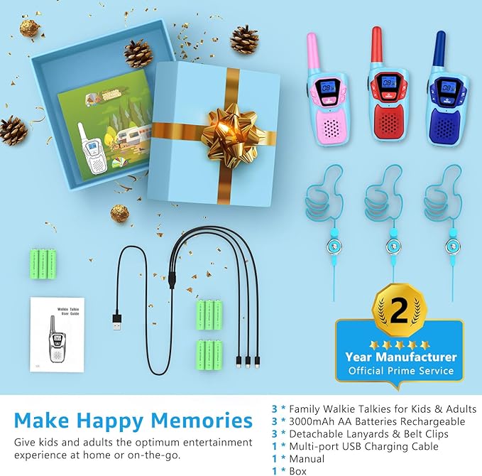 • Included Components : 1 * Manual & 3 Year Manufacturer Service, 1 * Multi-port USB Charging Cable, 3 * 3000mAh AA Batteries Rechargeable, 3 * Detachable Lanyards & Belt Clips, 3 * Family Walkie Talkies for Kids & Adults 1 * Manual & 3 Year Manufacturer Service, 1 * Multi-port USB Charging Cable, 3 * 3000mAh AA Batteries Rechargeable, 3 * Detachable Lanyards & Belt Clips, 3 * Family Walkie Talkies for Kids & Adults