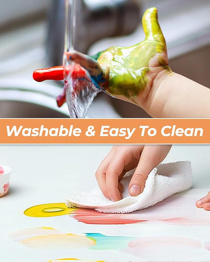 • Washable & Easy to Clean – These water-based paints rinse easily from hands, clothes, tables, and more with just soap and warm water—no scrubbing required. Paired with no-spill cups, they ensure quick, stress-free cleanup at home, school, or during art parties.
