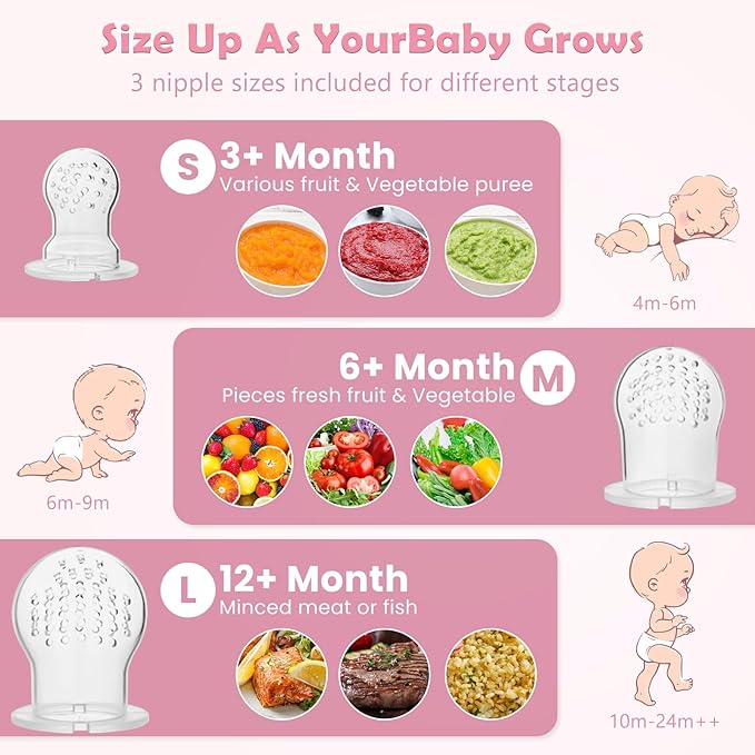 • 【ALL SIZES INCLUDED-Accompany with Your Baby Growth】:small, medium and large three sizes sacs are included in the fruit feeder package to fit different month age baby, S for 4-6 months, M for 6-10 months, L for 10 months+, you can choose the suitable size for your baby at different months.