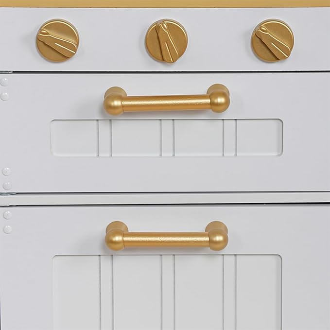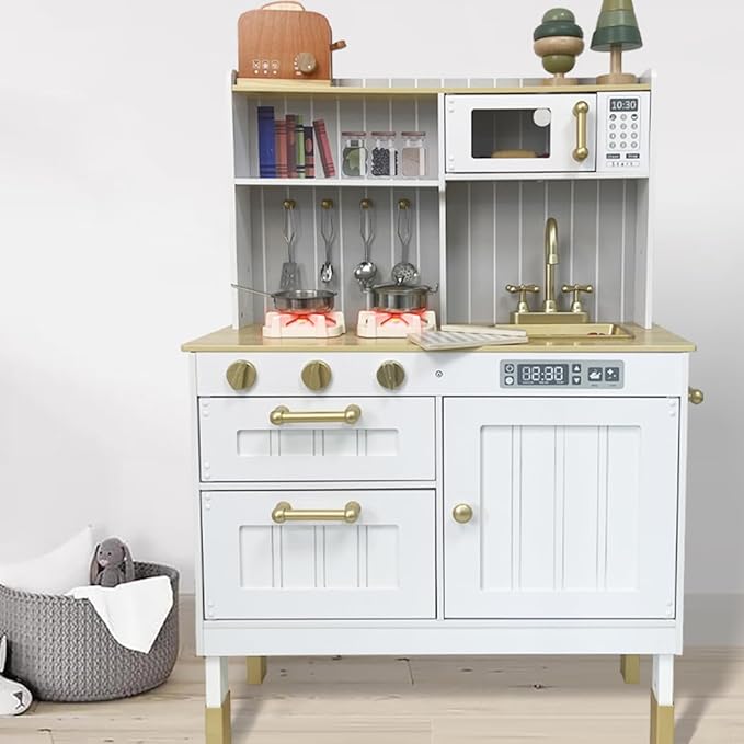 • Simulated Design - Wooden Play Kitchen with Lights and Sounds. The baby kitchen stoves feature real cooking set for kids,sounds that simulates a real one with three methods, make pretend play kitchen more lively and interesting, create an immersive play experience for children and kids.