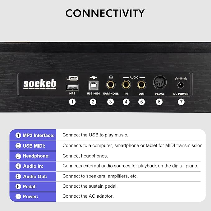 • MEDIA CONNECTIVITY: The electric keyboard piano offers seamless connectivity to devices such as smartphones,tablet, and computers through its MIDI-USB output, ensuring compatibility with music learning apps like POP Piano. With Bluetooth capabilities, this piano can also function as a speaker, fueling the passion for music education.