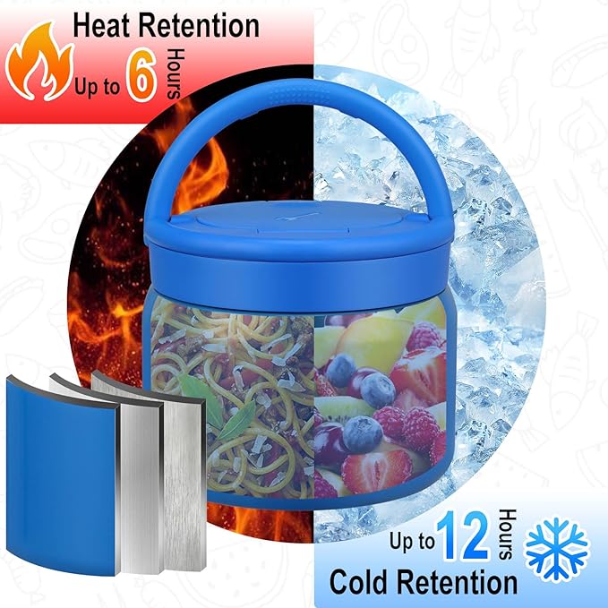 • Hot and Cold Food Thermo: This soup thermo is constructed with 18/8 (SUS304) stainless steel and vacuum insulation, keeping meals hot or cold for over 5 hours. It comes with a collapsible stainless steel spoon hidden conveniently in the lid, making it perfect for on-the-go dining.