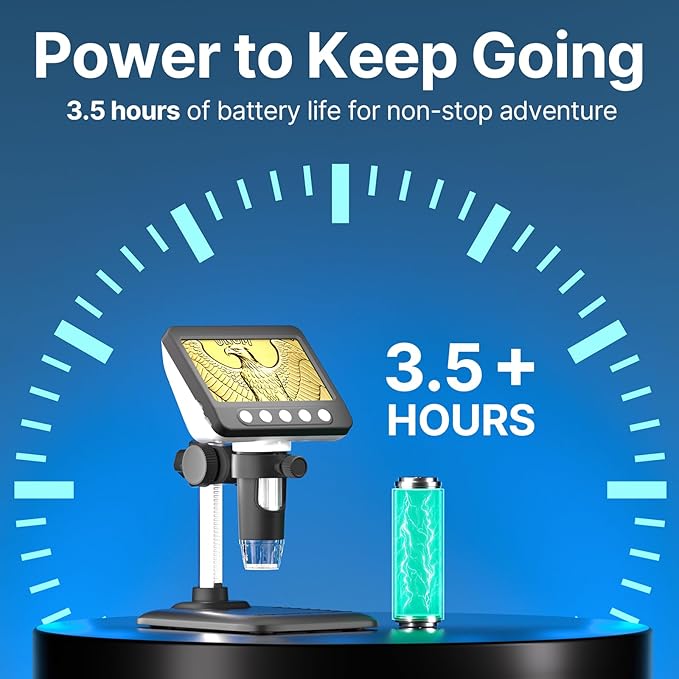 • Rechargeable Battery - WKR digital microscope is powered by a rechargeable battery (3.5 hours of working time) or directly via USB. Truly portable and independent. On a sunny day you can take your family or children to explore the magical and colorful miniature world.