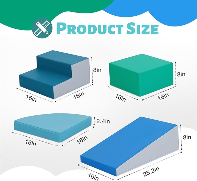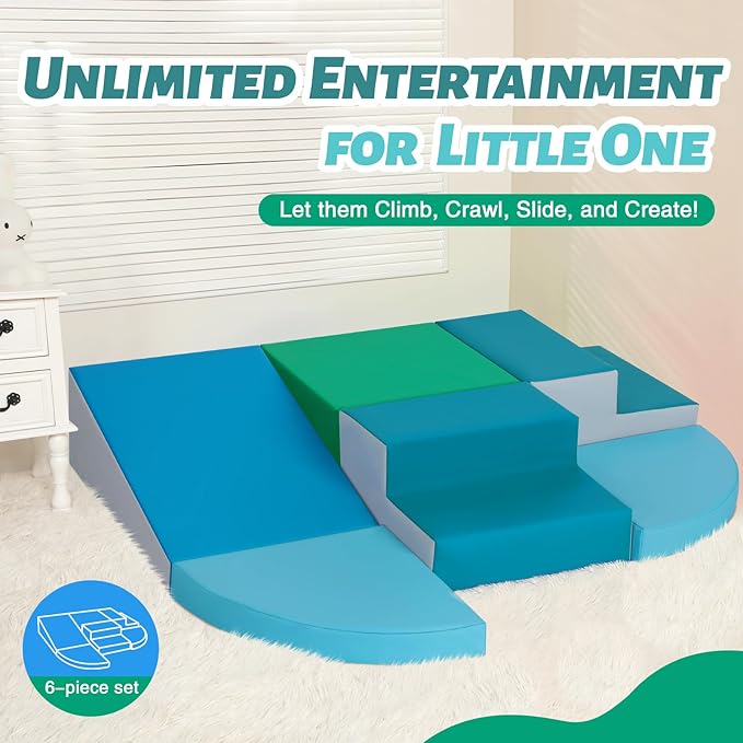 • 6-Piece Set: Baby climbing blocks consists of 2 dark green stairs, 2 sky blue half-moon, 1 green square and 1 navy slide. This soft play equipment stimulates your child's imagination to create endless combinations of structures, allowing them to enjoy the fun of the toy as they climb up and down, stacking and swapping four different shapes