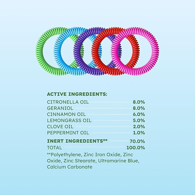 • Natural Plant Ingredients & DEET-Free Our mosquito bracelets are made with Geraniol Oil, Lemongrass Oil, and Citronella Oil, offering a natural and DEET-free mosquito repellent solution. Keep your family safe with effective protection from mosquito bites.