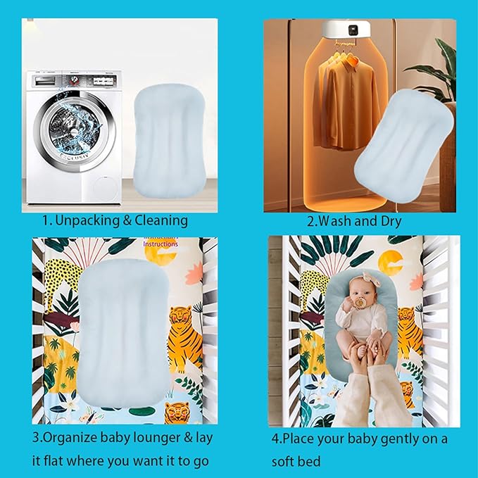 • Protective Guardrail Design: The baby lounger features raised guardrails, to provide gentle support and prevent rolling during play or rest. Ideal for placement on flat, firm surfaces like beds, cribs, or changing tables (always ensure the surface is stable and supervised).