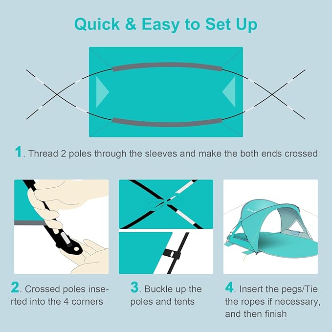 • Stable and Durable Construction: Equipped with sturdy 8mm thickened poles, 4 sandbags (2 on each side), 8 stakes (including 4 ground stakes and 4 plastic stakes), and 4 wind ropes, the tent can withstand 3-4 level wind forces to remain stable and secure, ensuring reliable windproof performance for your beach adventures
