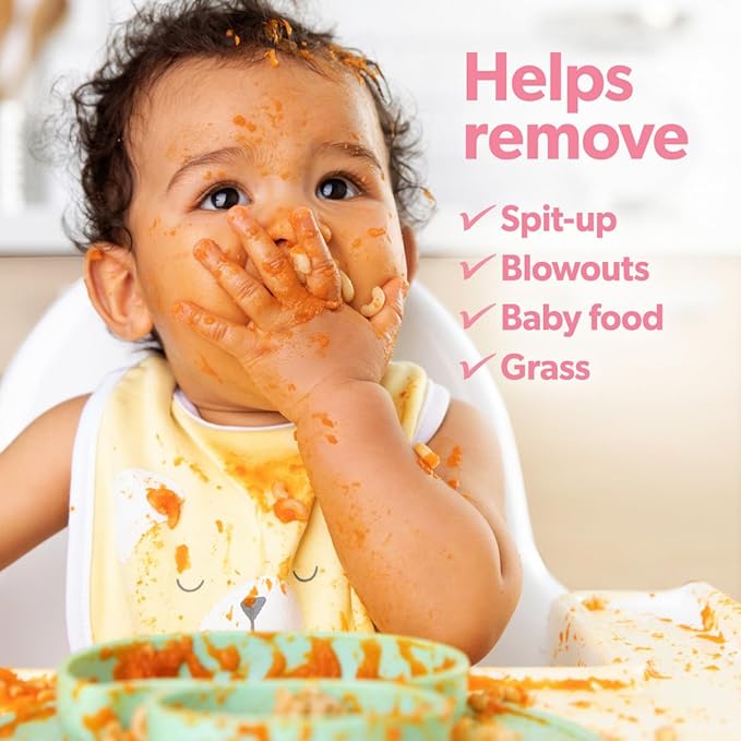 • WORKS ON ALL BABY & COMMON STAINS: Fights stains and odors from spit-up, blowouts, baby food, grass stains, the list goes on