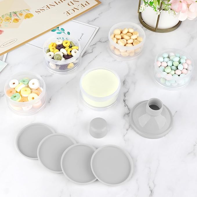• Capacity - 5 layers design. You can put quantity of baby formula on each layer. A total of 5 layers of pre measured milk powder or food can be placed. Very pratical formula container for on the go.