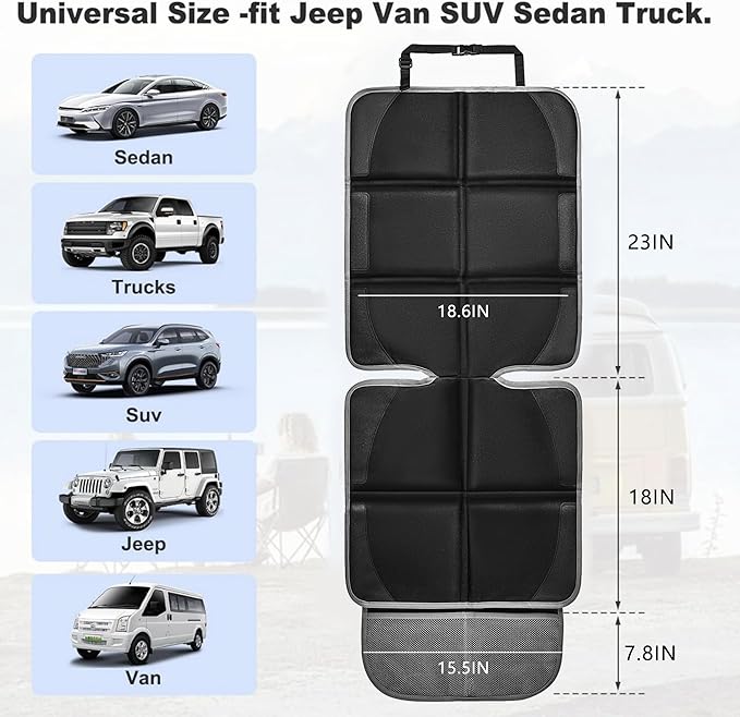 • The whole dimension of the auto seat protector carseat is 18.6 x 48.8 inch, the seat: 18 x 18.6 inch, the back: 23 x 18.6 inch, and the mesh pocket: 15.5 x 7.8 inch. Universal fit Jeep Van SUV Truck