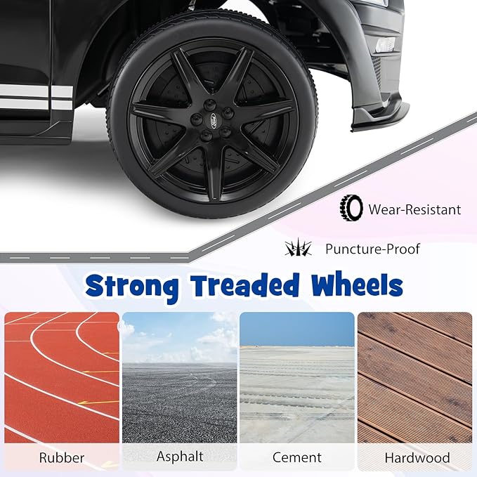 • Realistic Licensed Ford Car: Delight in the excitement of the ride on car, featuring 2.4 MPH high speed, 1.1 MPH low speed, one-button start, and soft start and stop for a smooth ride. This kids car also boasts 2 strong motors for young explorers to take adventures.