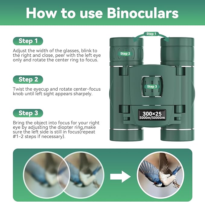 • 300X COMPACT BINOCULARS - Our binoculars are high powered with 300x magnification zoom and a 25mm large field of view, letting you observe and focus on the target in great detail 367ft/1000yds away. It's ideal binoculars for adults and kids, bird watching, hunting, camping, climbing, hiking, safari, travel, opera, concert, and sports events.
