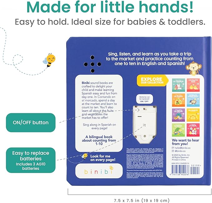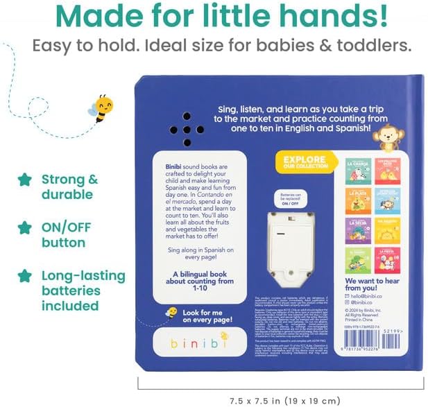 • ๐——๐˜‚๐—ฟ๐—ฎ๐—ฏ๐—น๐—ฒ & ๐— ๐—ฎ๐—ฑ๐—ฒ ๐—™๐—ผ๐—ฟ ๐—Ÿ๐—ถ๐˜๐˜๐—น๐—ฒ ๐—›๐—ฎ๐—ป๐—ฑ๐˜€. Binibi bilingual English-Spanish books for babies & toddlers 1-3 are durable and feature hard covers, thick pages and rounded corners - they are made for little hands and are easy to clean! All Spanish musical sound books feature an on/off button for extended battery life, and easily replaceable batteries. 3 AG10 batteries in every book.