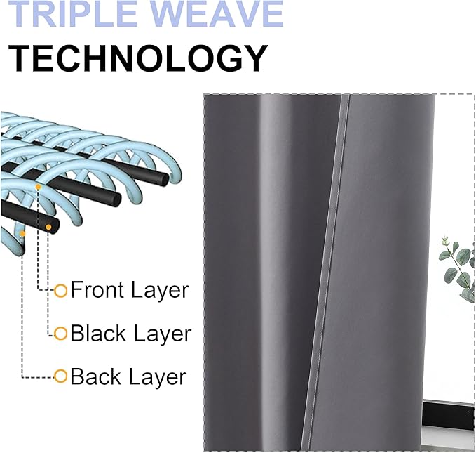 • High-Quality Materials: Crafted from high-quality polyester fiber, guarantee both stiffness and drape. This soft yet durable light-blocking fabric boasts a three-layer weave, with a middle layer of black yarn acting as an effective light-blocking panel, effectively blocking light while providing privacy. The identical colors on both sides further enhance its aesthetic appeal, adding a touch of elegance to your home.