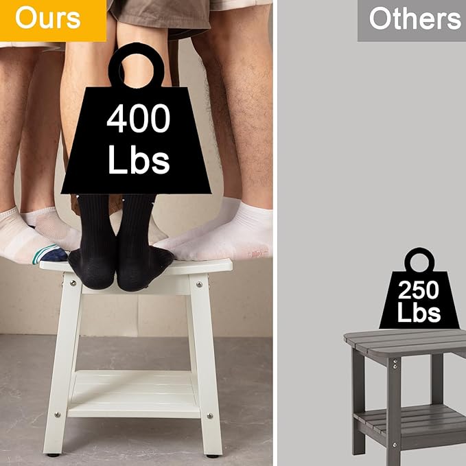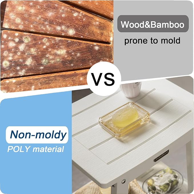 • 【Material & Size】Our poly shower bench is made of HDPS (polystyrene) with 304 stainless screws which never gets rust, this material is not easy to get rotting or crack after prolonged exposure to humidity, no splinters and no maintenance, 16 x 12.6 x 17 Inches enough large to sit (THE MOST IMPORTANT IS NO MAINTENANCE)