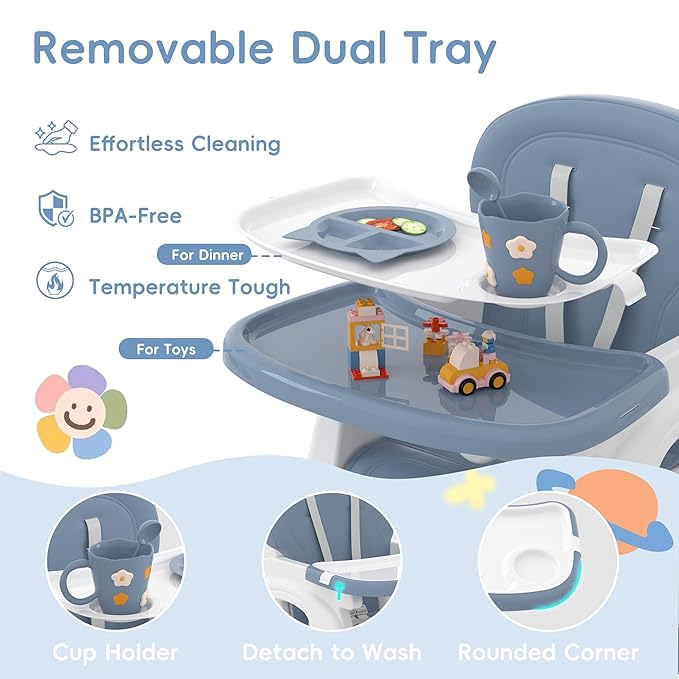 • 🍼 REMOVABLE DUAL TRAY - The baby feeding chair includes a removable double tray, perfect for meals and playtime. The top tray features a built-in cup holder, while the bottom tray provides a spacious play surface. Made from BPA-free PP material, these trays are safe for your child and easy to clean.