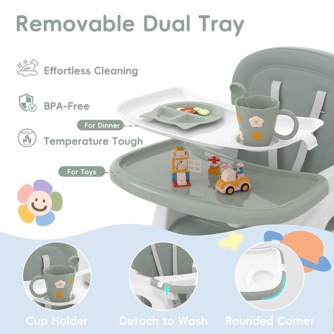• 🍼 REMOVABLE DUAL TRAY - The baby feeding chair includes a removable double tray, perfect for meals and playtime. The top tray features a built-in cup holder, while the bottom tray provides a spacious play surface. Made from BPA-free PP material, these trays are safe for your child and easy to clean.