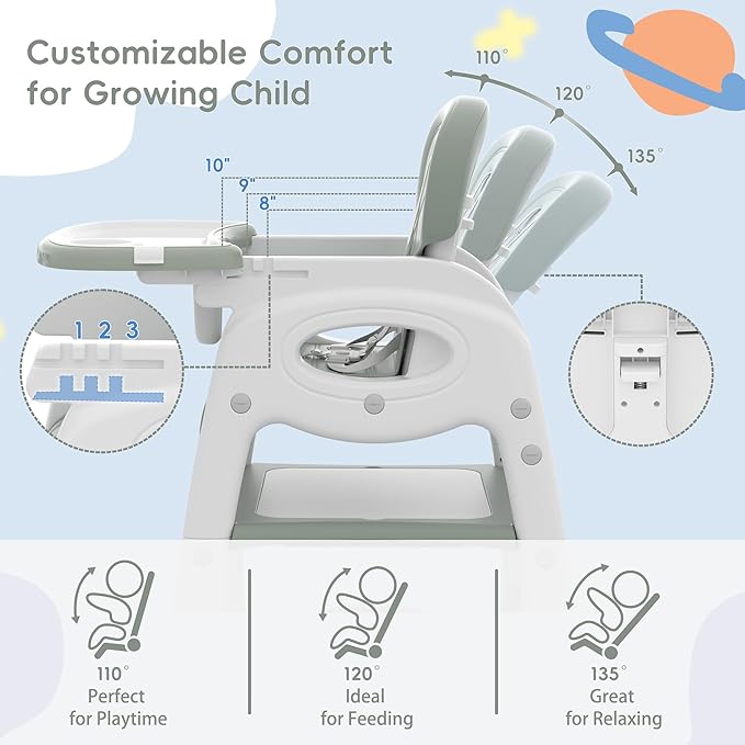 • 🍼 ADJUSTABLE SEAT BACK & TRAY POSITIONS - Featuring a 3-position reclining backrest(110°, 120°, 135°), this baby food chair offers customized comfort for different activities. The tray adjusts to three positions, providing ample space as your child grows. The soft, skin-friendly PU seat cushion is removable and easy to clean.