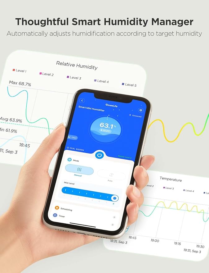 • Intelligent Humidity Control: Say goodbye to complicated adjustment. With auto mode, simply set your ideal humidity from 30% to 80%, and the built-in sensor will continuously monitor and adjust humidity levels (±3% tolerance) no need thermometer hygrometer, making it ideal for kids room, plants, nursery and bedroom.