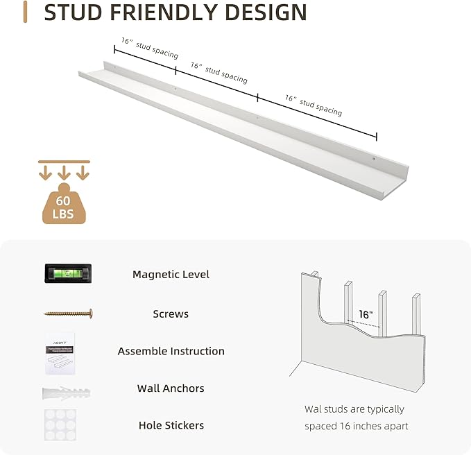 • 【Superior Quality】 Crafted from high-quality wood, each floating shelf is designed for long-lasting durability. The pre-drilled mounting holes are spaced 16 inches apart, ensuring a secure installation into wall studs.