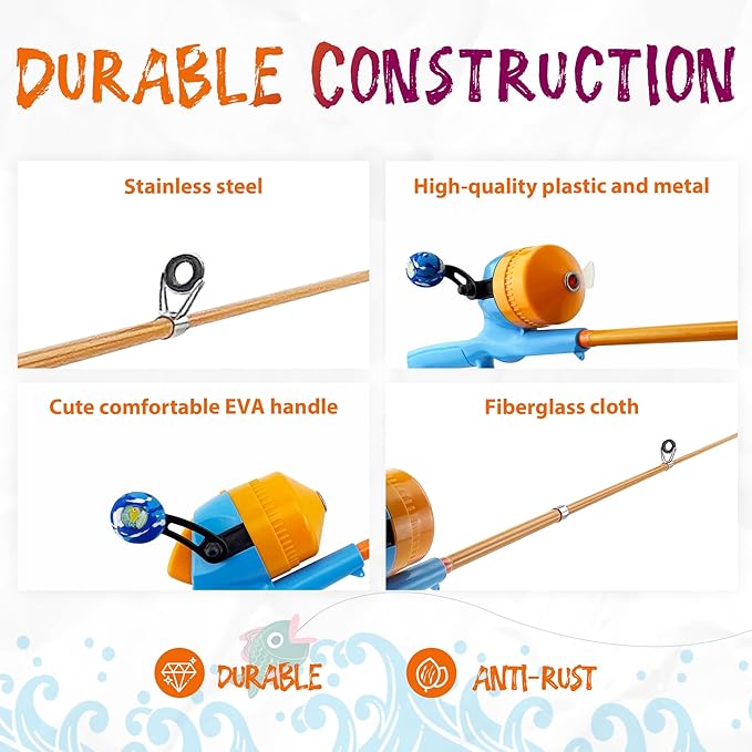 • Durable Construction: Our fishing rod's guide eyes use stainless steel instead of iron to make them less rusty. The fishing spin-cast reel with high-quality plastic and metal, which is more durable. The four-layer fiberglass cloth makes the fishing rod have better toughness and is not easy to break and rust, and it is also beneficial to the safety of children