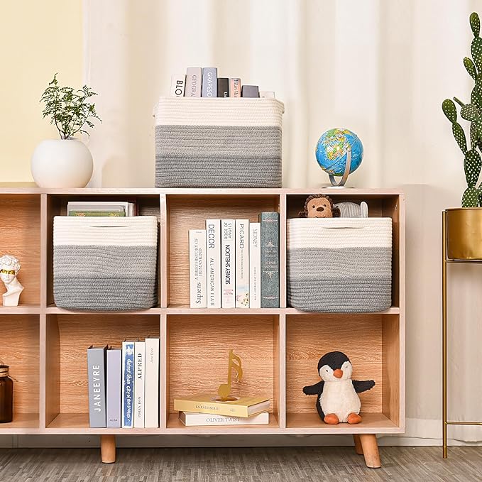 Storage Baskets for Organizing Shelves, Woven Cotton Rope Baskets for Storage Books Towels Toys, Organizing Baskets, Toy Basket for Nursery Bathroom, 15"x11"x9.5", 3 Packs, Gradient Grey