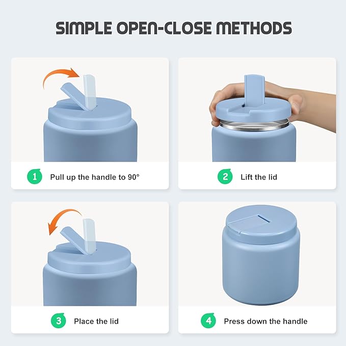 • Use Tips and Notes: In order to keep food hot or cold for a longer time, we recommend preheating/precooling with hot water/ice water for 5~10 minutes before putting food or soup into the food jar, and then put the food in. Note that when you disassemble the cover for cleaning and then reinstall it, be sure to lift the top of the cover before installing it. Otherwise, it will not be firm!!!