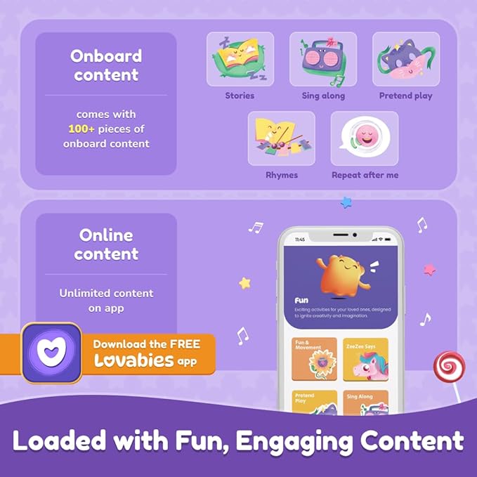• Two Fun Modes: Offline Mode with built-in stories, rhymes, and games; Bluetooth Mode unlocks even more content through the Lovabies app