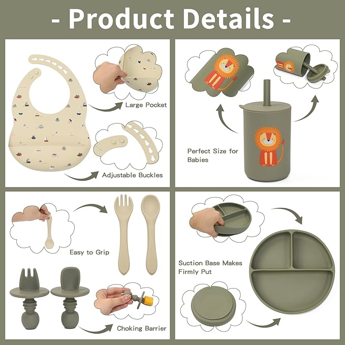 • Baby Feeding Set: Get your baby to love mealtime and free up mom's hands! This 8-piece baby feeding set includes 1 suction-divided plate, 1 straw cup, 2 baby bib with a catch pocket, 1 first-stage toddler fork, 1 first-stage toddler spoon,2 long-handled forks and spoons