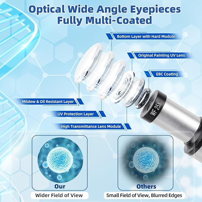 • Ten Magnification Settings: WF25X and 10X eyepieces alone or with 2X lens, cooperate 4x 10x 40x 185 metal achromatic objective lenses, biological microscopes offer 10 magnification settings, 40X, 80X, 100X, 200X, 250X, 400X, 500X, 800X, 1000X, 2000X