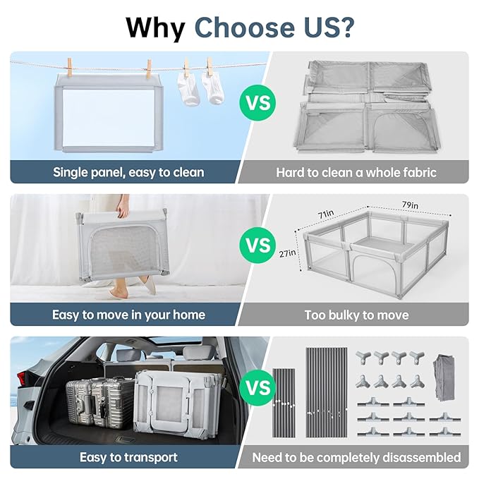 • [Extra Large Space]: With dimensions of 79 x 71 inches,the baby playpen provides spacious space for both parents and toddlers, ensuring a safe and fun environment for your baby to explore whether indoors or outdoors.