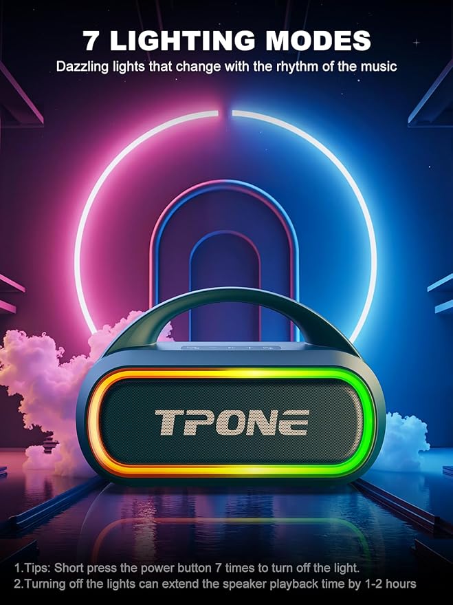 • 【Advanced Bluetooth & Powerful Battery】Equipped with the latest Bluetooth 5.3 chip, it ensures fast pairing and stable connection, and automatically reconnects to the last used device. Each charge can experience up to 12 hours of game time, let us enjoy the music day and night, The multicolor lights on the speaker can also be turned off with a simple button press to save the battery and adapt to your needs. Keep in mind that the actual play time may vary depending on the volume, audio content, and usage.