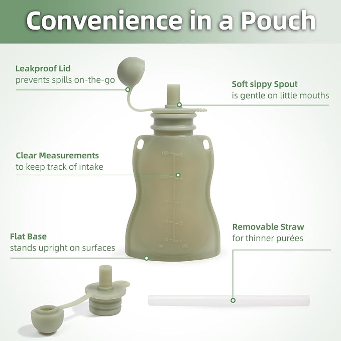 • Independent Feeding: These reusable pouches for toddlers each come with a removable straw, which allows baby to eat safely at their own pace and prevents squeezing and spilling. The lid is attached to the spout so you don't have to worry about mess or loss, and the bottle has a leak-proof design that won't cause a messy meal.