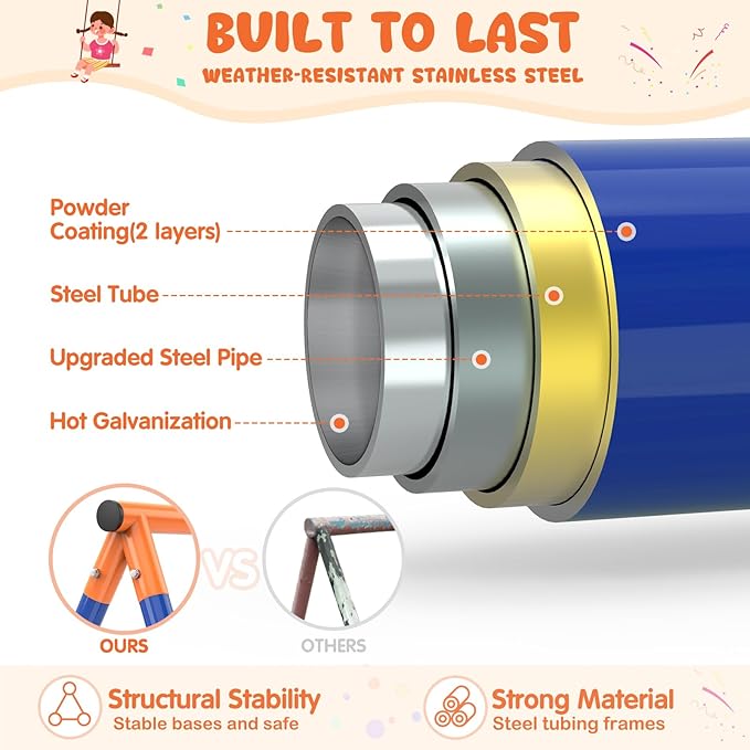 • Safety First: The swing set for backyard has undergone rigorous testing, including the US CPC and safety certifications, the steel surfaces are hot dip galvanised inside and outside with lead free zinc, ensuring a safe and reliable kids experience