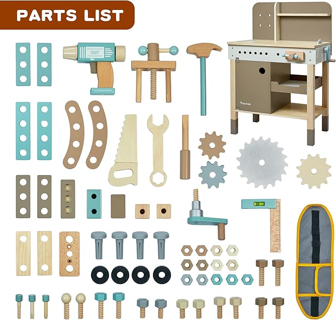 • Toy Workbench - This wooden workbench including a hammer, saw, screwdriver, wrench, vise,screws, nuts, bolts, gears, links and more creative parts for building. Kids can work on together for hours,This is a fun process that develops your little one’s motor skills and hand-eye coordination.