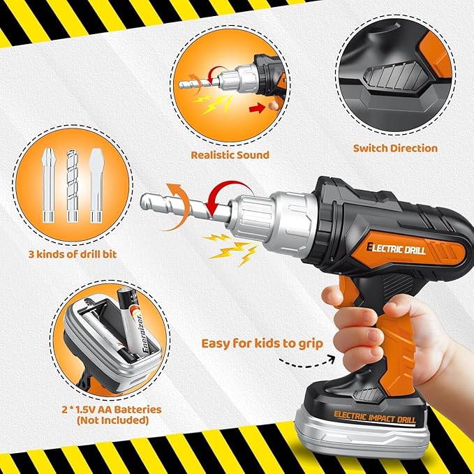 • This realistic toy drill set features 3 interchangeable drill bits for versatile play. Press the switch to activate the buzzing sound and drilling motion, mimicking a real drill! The engaging sounds and movements encourage imaginative play and creativity. This tool set makes a wonderful gift for children ages 3 and up.