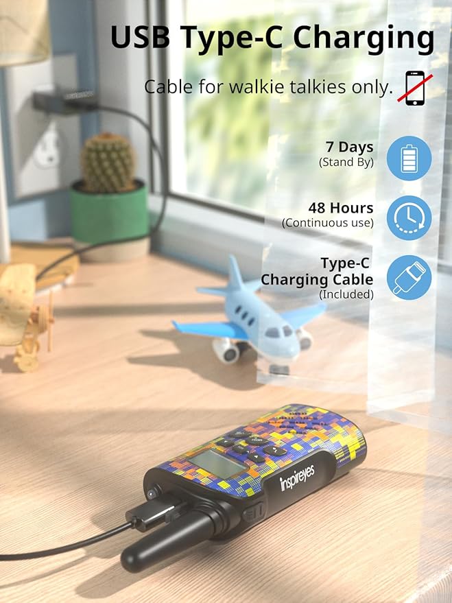 • Inspireyes rechargeable kids walkie talkies are rechargeable and long lasting, featuring an upgraded built-in lithium polymer battery. There is no need to buy extra AAA batteries. Kids can enjoy up to 48 hours of playtime and 7 days of standby on a single charge.