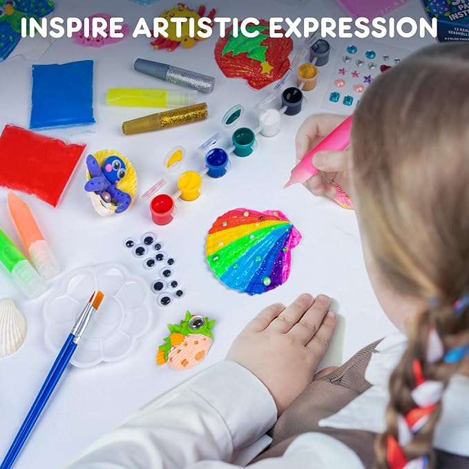 • Super Value Paint Set - This kids activities crafts includes 12 real seashells, 8 standard paints, 2 glitter glues, 4 glow-in-the-dark paint, 5 modeling clays, 10 paris of eyes stickers, gem stickers, 10 adhesive sticky, paint tray, brushes and instruction - all-in-one kit for fun